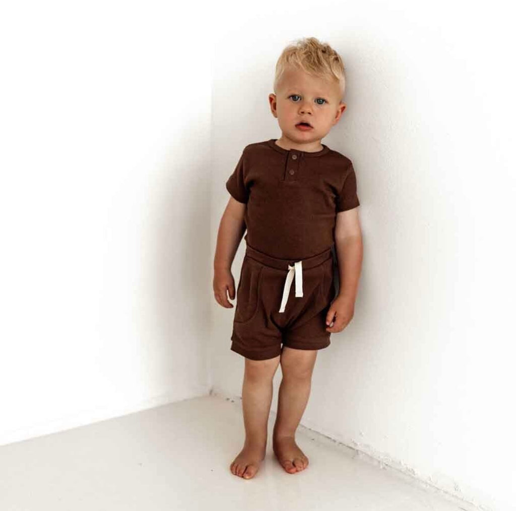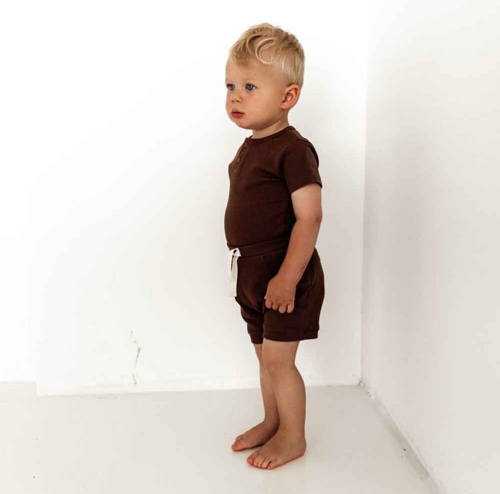 Snuggle Hunny organic chocolate shorts are made for babies and toddlers. They are practical whilst being very stylish. Soft and stretchy, they are an easy care, fuss-free option that’s simple to coordinate thanks to their relaxed style. They are a perfect match with our organic baby short sleeve bodysuits and they will be a go-to short for bub. Our pants, and all our clothing, is made with Certified Organic Cotton.