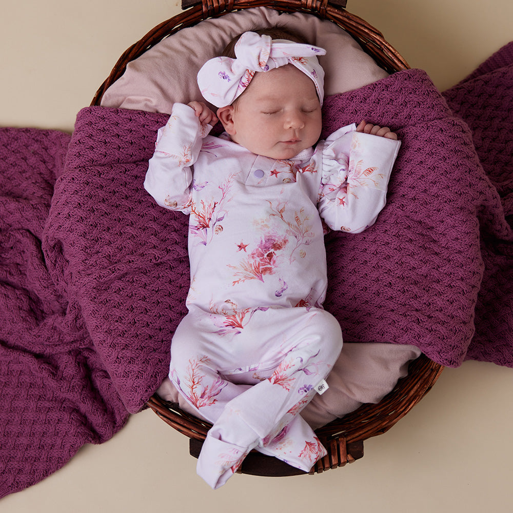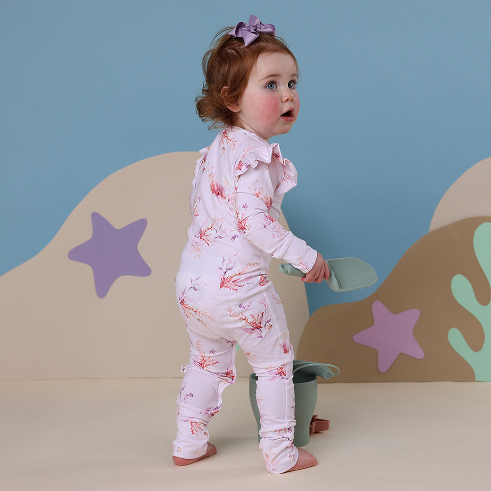 Our Coral growsuit comes with beautiful frills on the shoulders. We have also included foldable hand mittens for newborn to 6 months. Hand mittens help stop little nails from scratching and also keep hands warm when the weather is cool. Bub can wear the mittens open or closed. For sizes from 6 months upwards, the mittens are replaced with a stylish cuff. Foot mittens are also an important feature and these are included on all sizes. Who doesn’t love to tuck in those little feet for bedtime to keep warm?