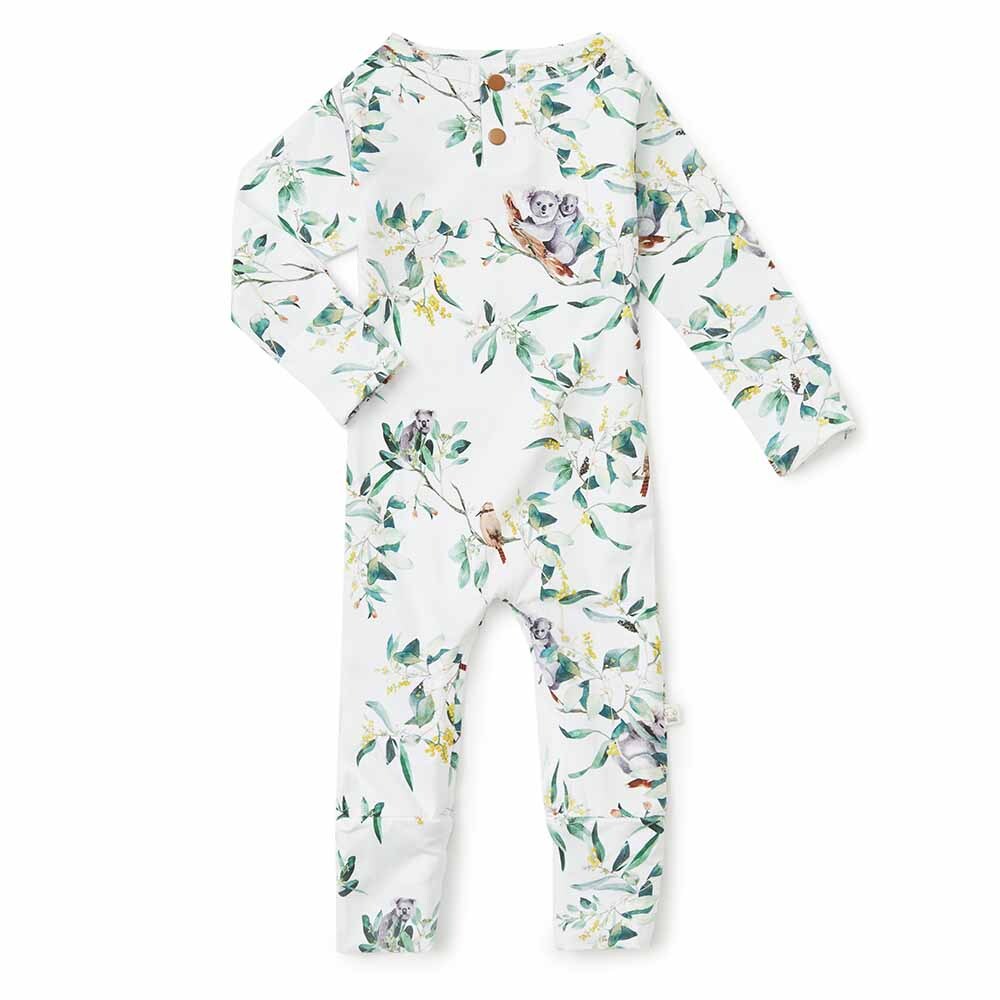 Snuggle Hunny organic growsuits are made for babies and toddlers and our exclusive Eucalypt print is beautiful, great for boys and girls, and features Koalas and Kookaburras, a beautiful nod to Australiana flora and fauna .