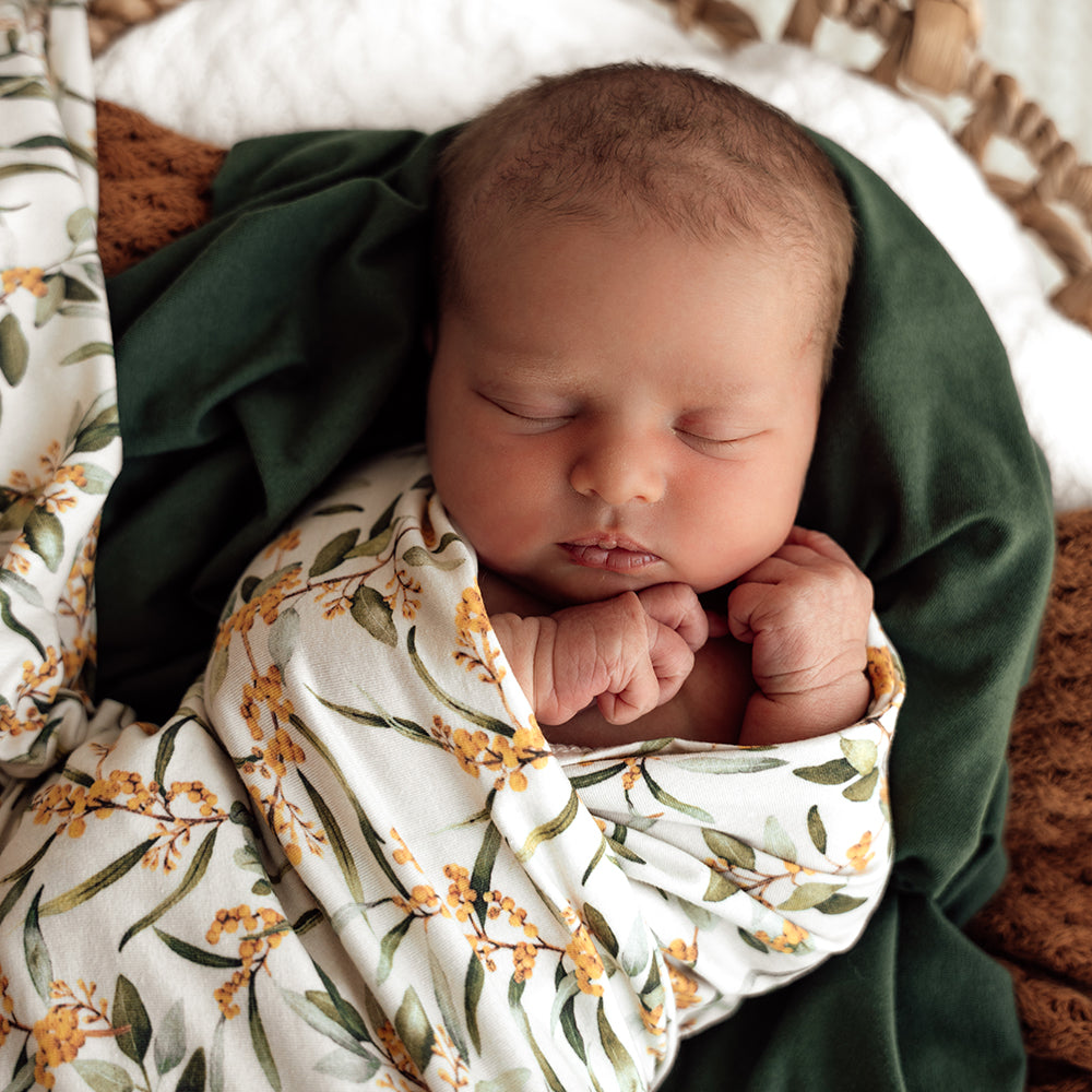 Our Snuggle Hunny organic cotton jersey wrap with matching topknot is soft, snuggly and stretches with baby. This wrap features our exclusive Snuggle Hunny Golden Wattle design and is made with GOTS Certified Organic Cotton CU 1182228.