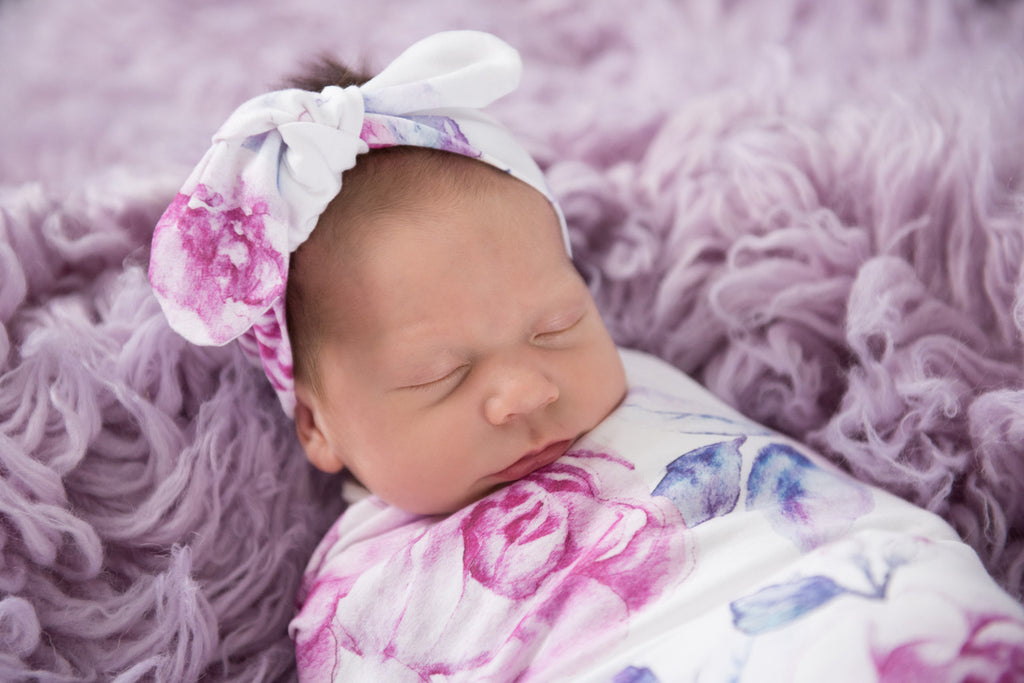 Lilac Skies Baby Jersey Wrap and Topknot is soft and romantic filled with pink and lilac roses.