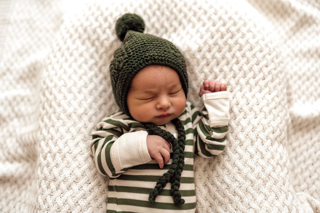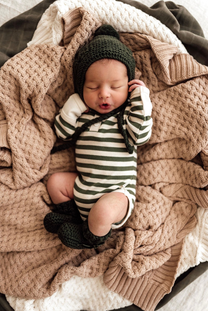 Fall in love with our handknit soft and snuggly Olive Merino Wool Bonnet & Bootie Set. Handknit heirloom quality made from 100% Merino Wool.