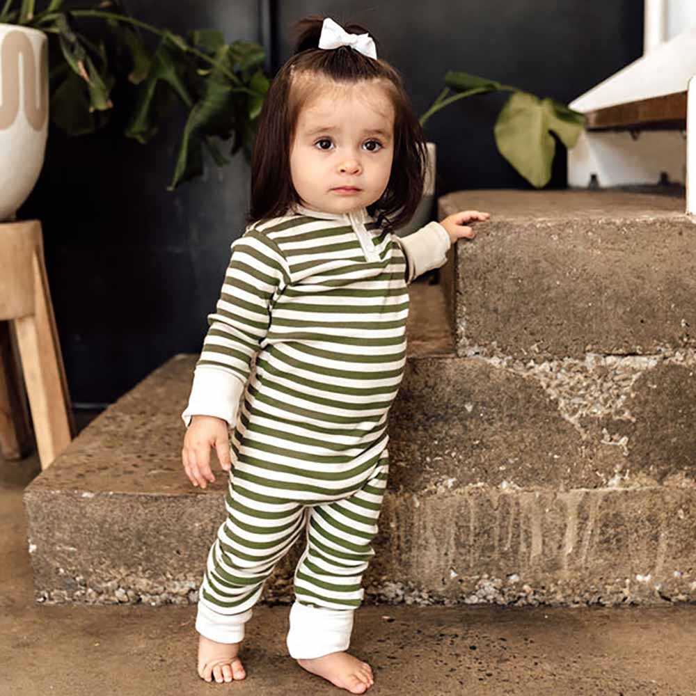Snuggle Hunny organic growsuits are made for babies and toddlers and our exclusive Olive Stripe ribbed cotton design is a beautiful colour great for boys and girls.