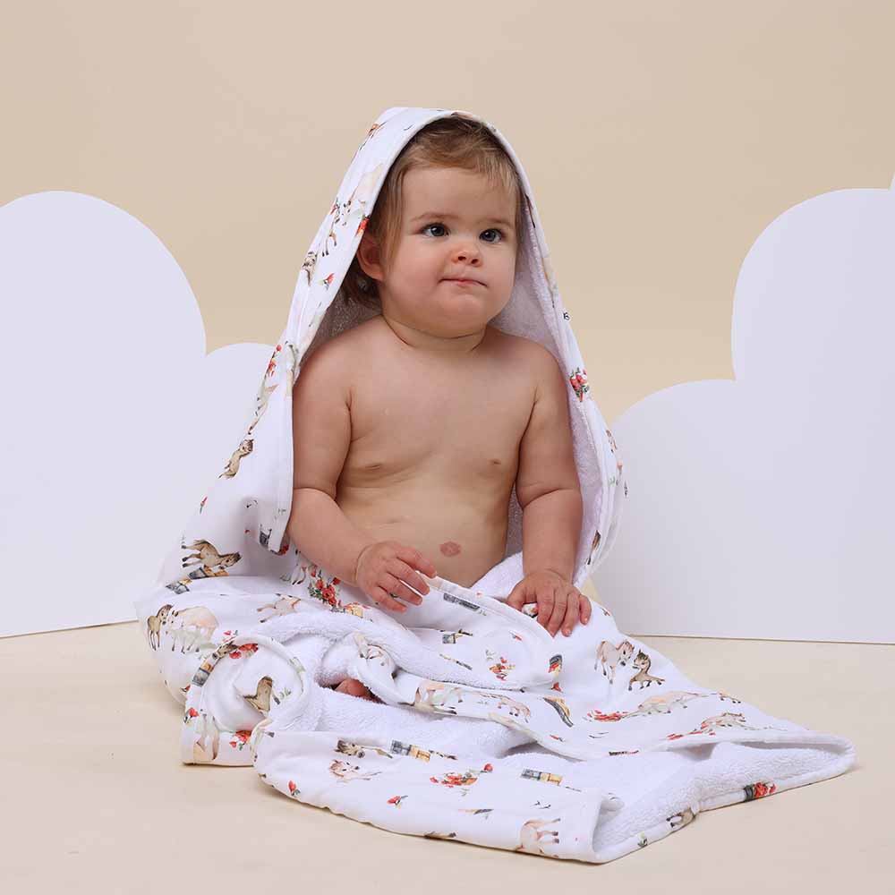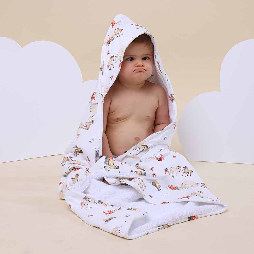 This beautiful extra large organic baby towel in Pony Pals is the perfect size for babies and toddlers and will brighten up any bathroom. Pony Pals is part of our Country collection.