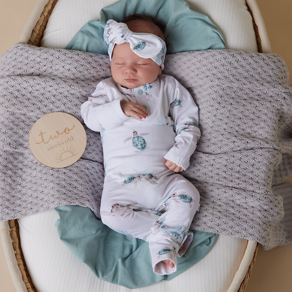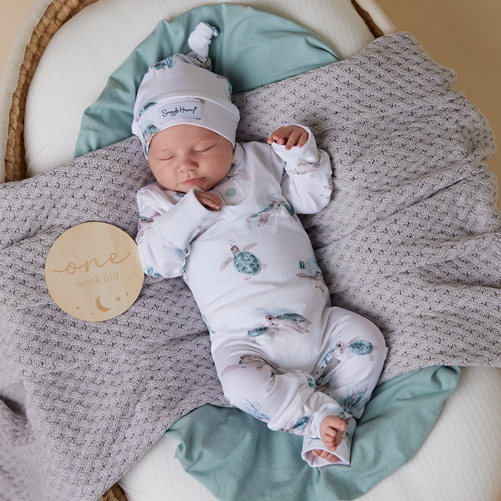 We have also included foldable hand mittens for newborn to 6 months. Hand mittens help stop little nails from scratching and also keep hands warm when the weather is cool. Bub can wear the mittens open or closed. For sizes from 6 months upwards, the mittens are replaced with a stylish cuff. Foot mittens are also an important feature and these are included on all sizes. Who doesn’t love to tuck in those little feet for bedtime to keep warm?