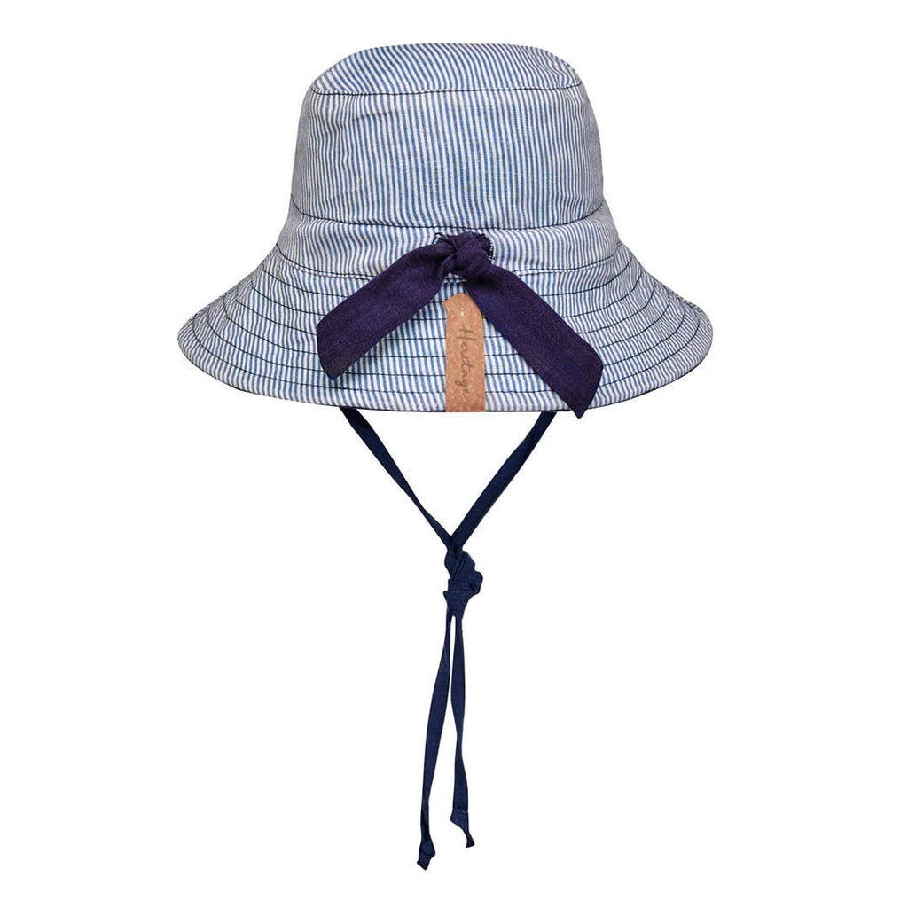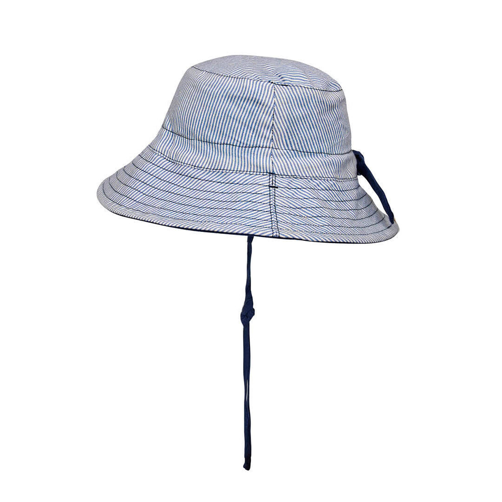 There is nothing more classic than a French ticking fabric and this Charlie print is a pretty close match! Beautiful skinny stripes of white and navy with a reverse of solid indigo, you can’t go wrong with this hat! Available in Baby Flap Hat, Bonnet, Classic Bucket and Ladies Sun Hat.