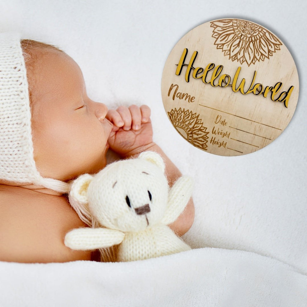 Specifications: This birth announcement disc is laser carved on a 3mm natural plywood and has a 3D effect. Approx 14.5cm Width