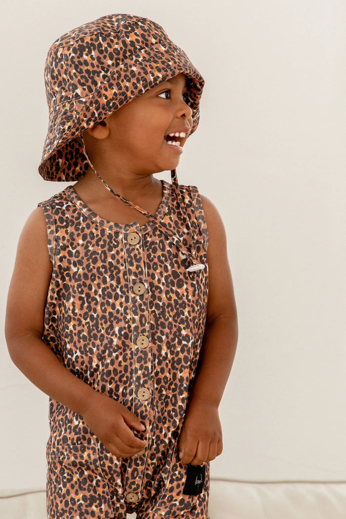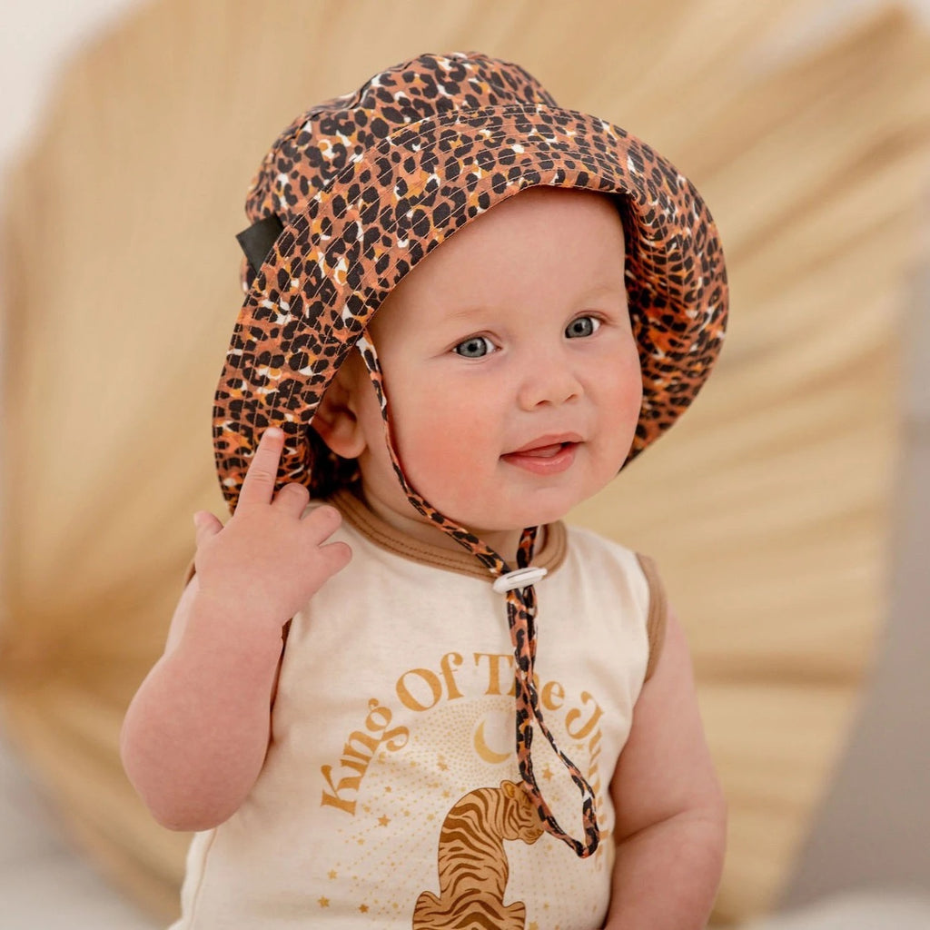 This sun hat features our Exclusive Feline print on 100% woven cotton and an adjustable toggle tie.