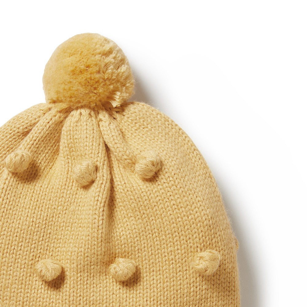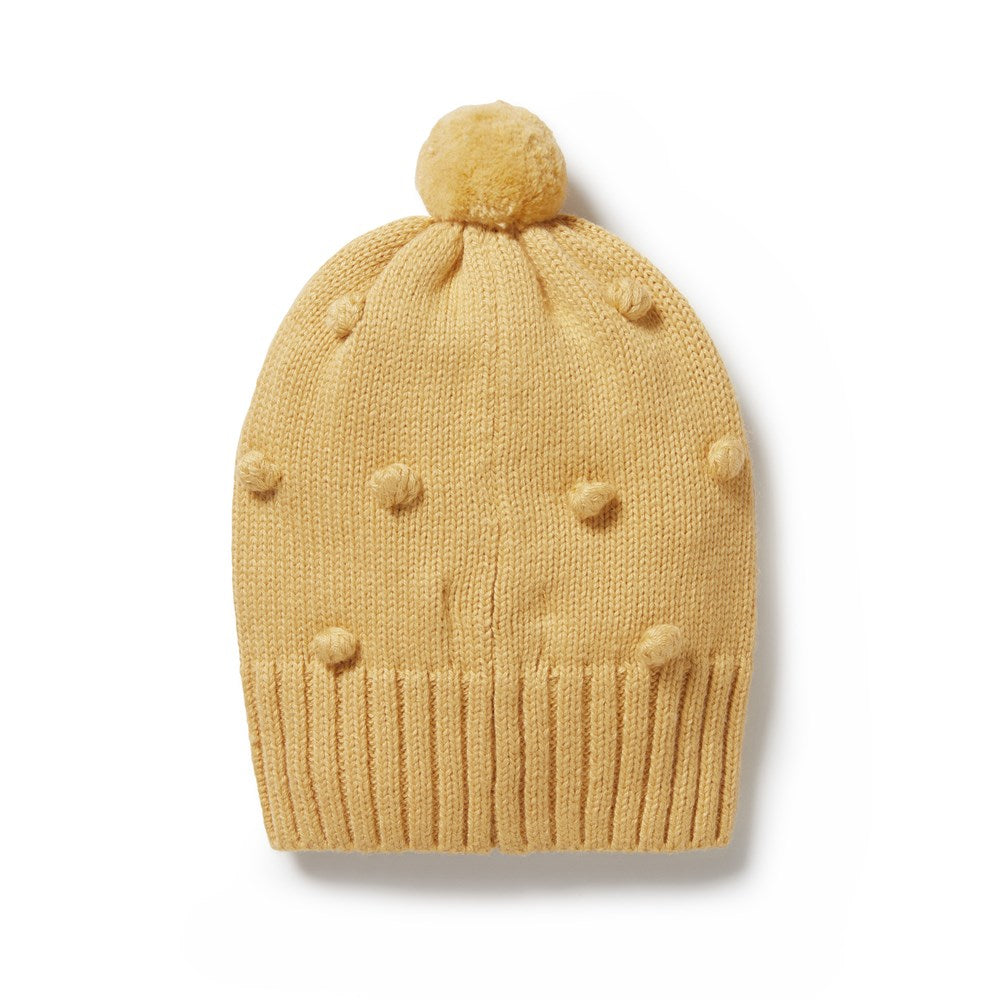 This knitted bauble beanie with pom pom keeps your baby's head warm and stylish. Crafted from a Cotton, Bamboo and Wool blend, this cosy knit hat offers optimal warmth and softness for your little one. Perfect for completing their outfit, this hat is sure to keep them comfy and looking cute.