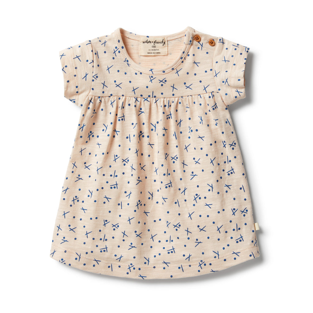 Made from a soft slub cotton, this mid length dress features a gathered yoke at front and side neck button opening is for easy dressing.