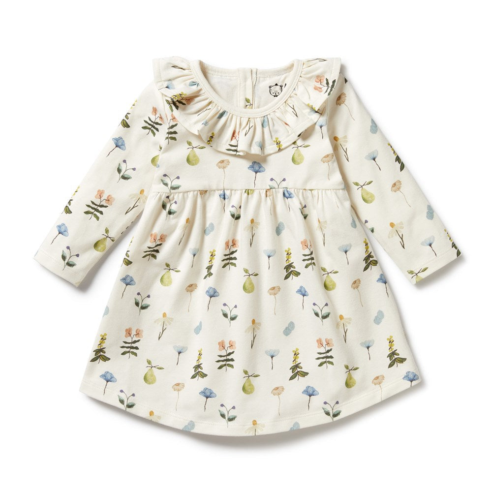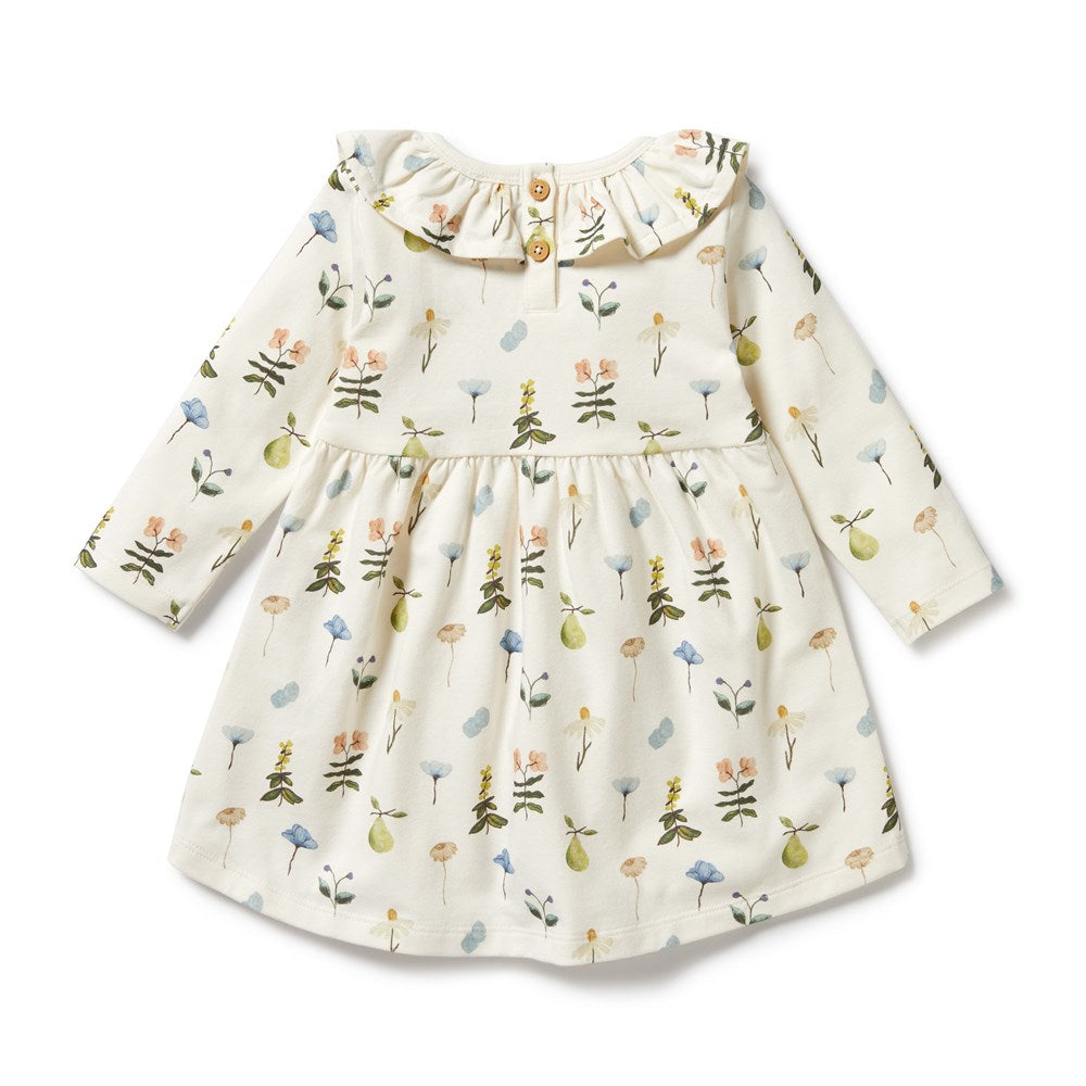 Discover the ultimate in sustainable fashion with our organic cotton ruffle winter dress! Mid-length for versatile wear, this dress features a gathered neckline and convenient back neck button for easy dressing. Perfect solo or paired with tights, it's a worthy addition to your wardrobe.
