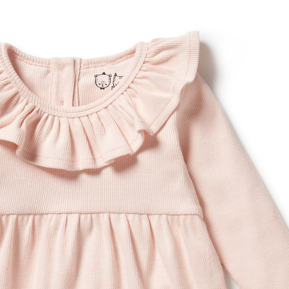 Discover the ultimate in sustainable fashion with our organic cotton ruffle winter dress! Mid-length for versatile wear, this dress features a gathered neckline and convenient back neck button for easy dressing. Perfect solo or paired with tights, it's a worthy addition to your wardrobe.