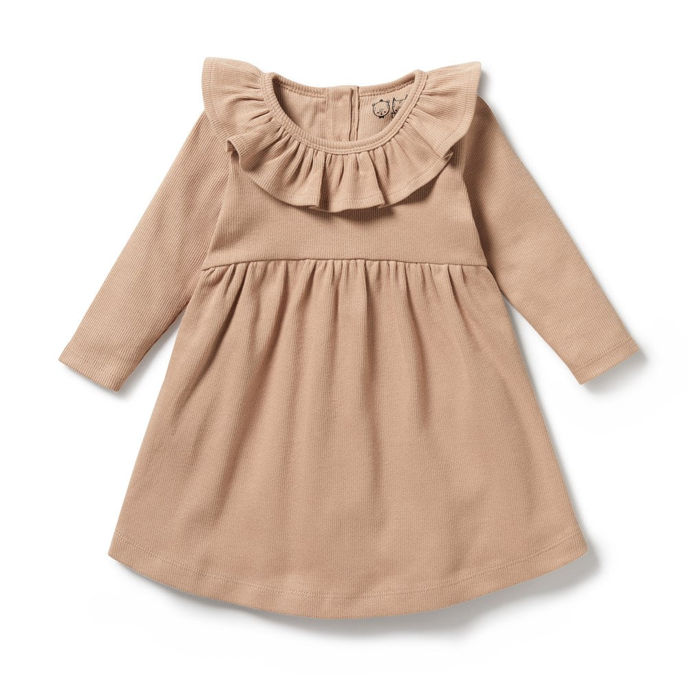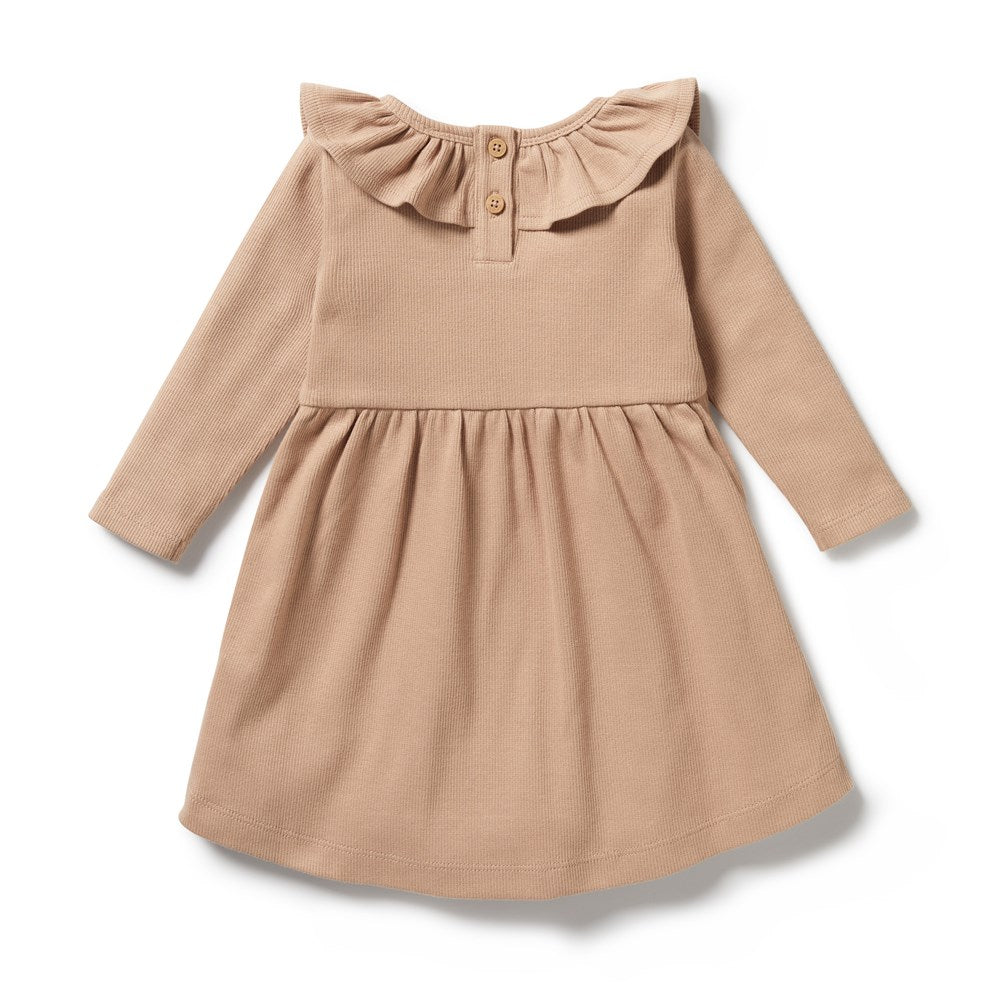 Discover the ultimate in sustainable fashion with our organic cotton ruffle winter dress! Mid-length for versatile wear, this dress features a gathered neckline and convenient back neck button for easy dressing. Perfect solo or paired with tights, it's a worthy addition to your wardrobe.