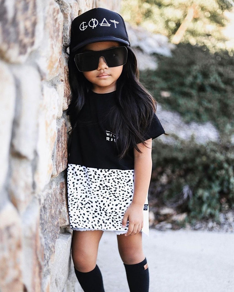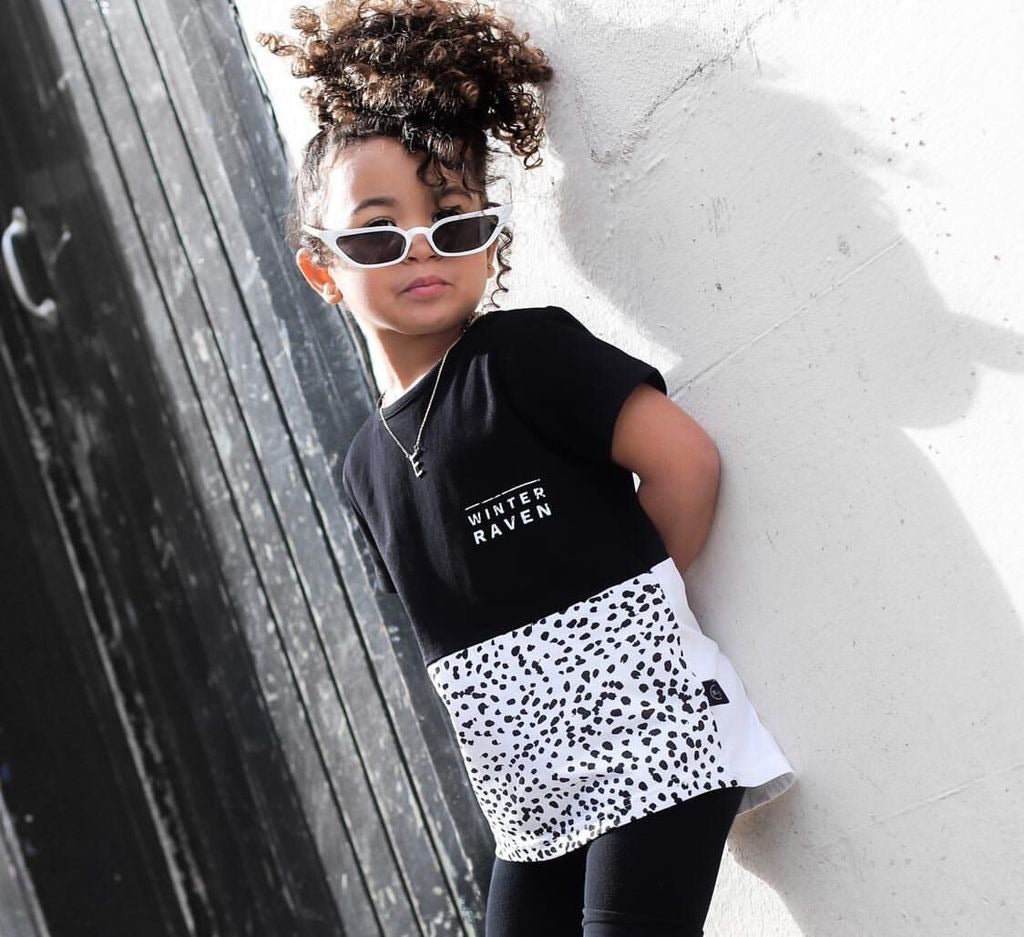This two toned black and white tee is one of our most comfortable tops yet. Made with 95% Organic cotton - 5% Spandex, it features a black and white spotted print for that extra touch.