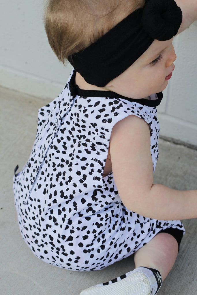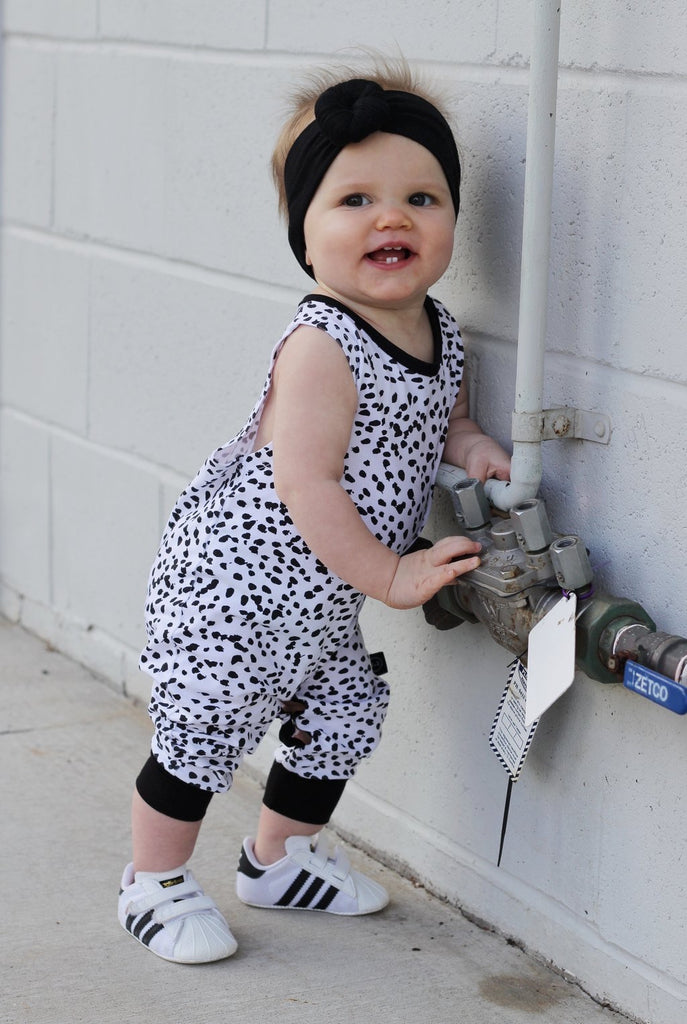 This black and white printed romper is a staple item for your little ones wardrobe featuring button snaps at the crutch and back for easy changes. Made with 95% Organic cotton - 5% Spandex