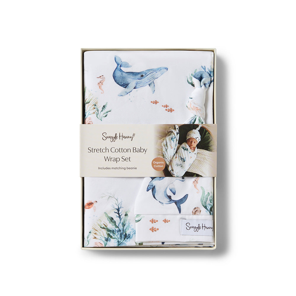 Our Snuggle Hunny organic cotton jersey wrap with matching beanie is soft, snuggly and stretches with baby. This wrap features our exclusive Snuggle Hunny Ocean design and is made with GOTS Certified Organic Cotton CU 1182228.