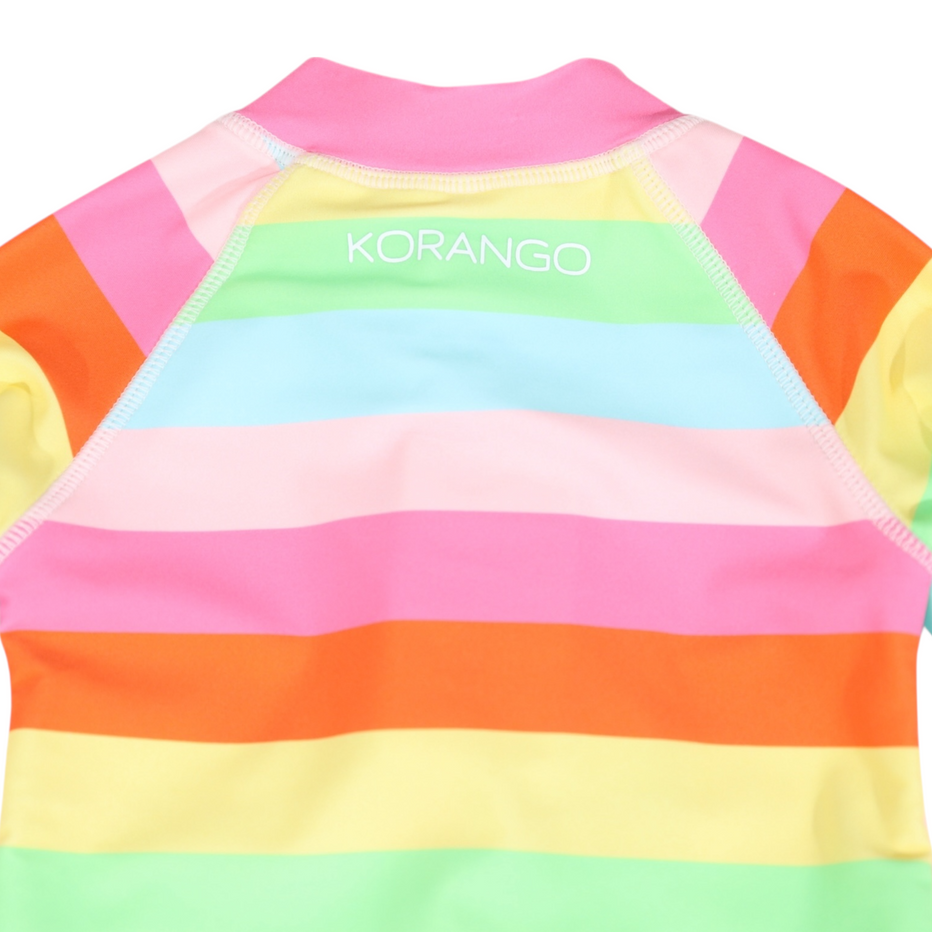 Splash into colour and comfort with the Korango Girl Rainbow Swimsuit! Perfect for sunny days, this suit features a fun rainbow design she'll love. Long sleeves and UPF 50+ fabric provide superior sun safety, while the chlorine-resistant material ensures colours stay bright. With a fitted design and an easy-pull zipper offer all-day comfort and quick changes. It�s practical protection for non-stop play, letting her enjoy every moment in the water.